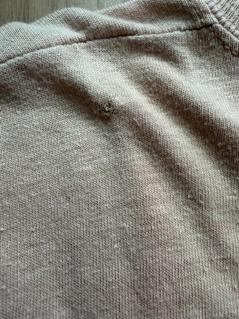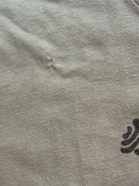 使用感があります。正面から見てフロントプリント左上と背面左肩付近に数mmのリペア痕がございます。